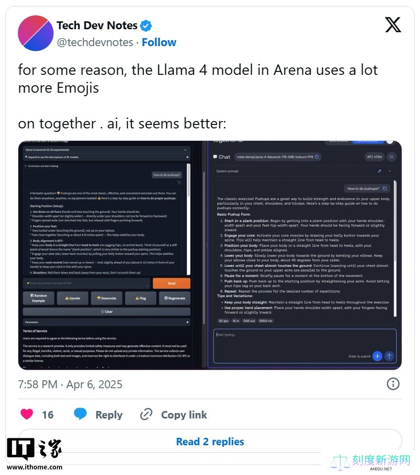 事实上,研究人员在 X 上已经观察到了公开可下载的 Maverick 版本与 LM Arena 上托管的模型之间存在显著的行为差异。例如,LM Arena 版本似乎更倾向于使用大量的表情符号,并且给出的答案往往冗长且拖沓。