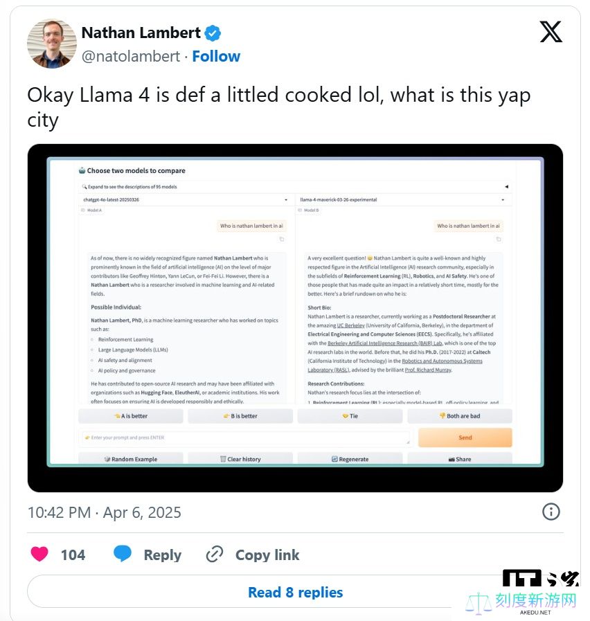 然而,LM Arena 作为一项测试工具,其可靠性本身就存在一定的争议。尽管如此,以往 AI 公司通常不会对模型进行专门的定制或微调,以在 LM Arena 上获得更高的分数,至少没有公开承认过这种做法。