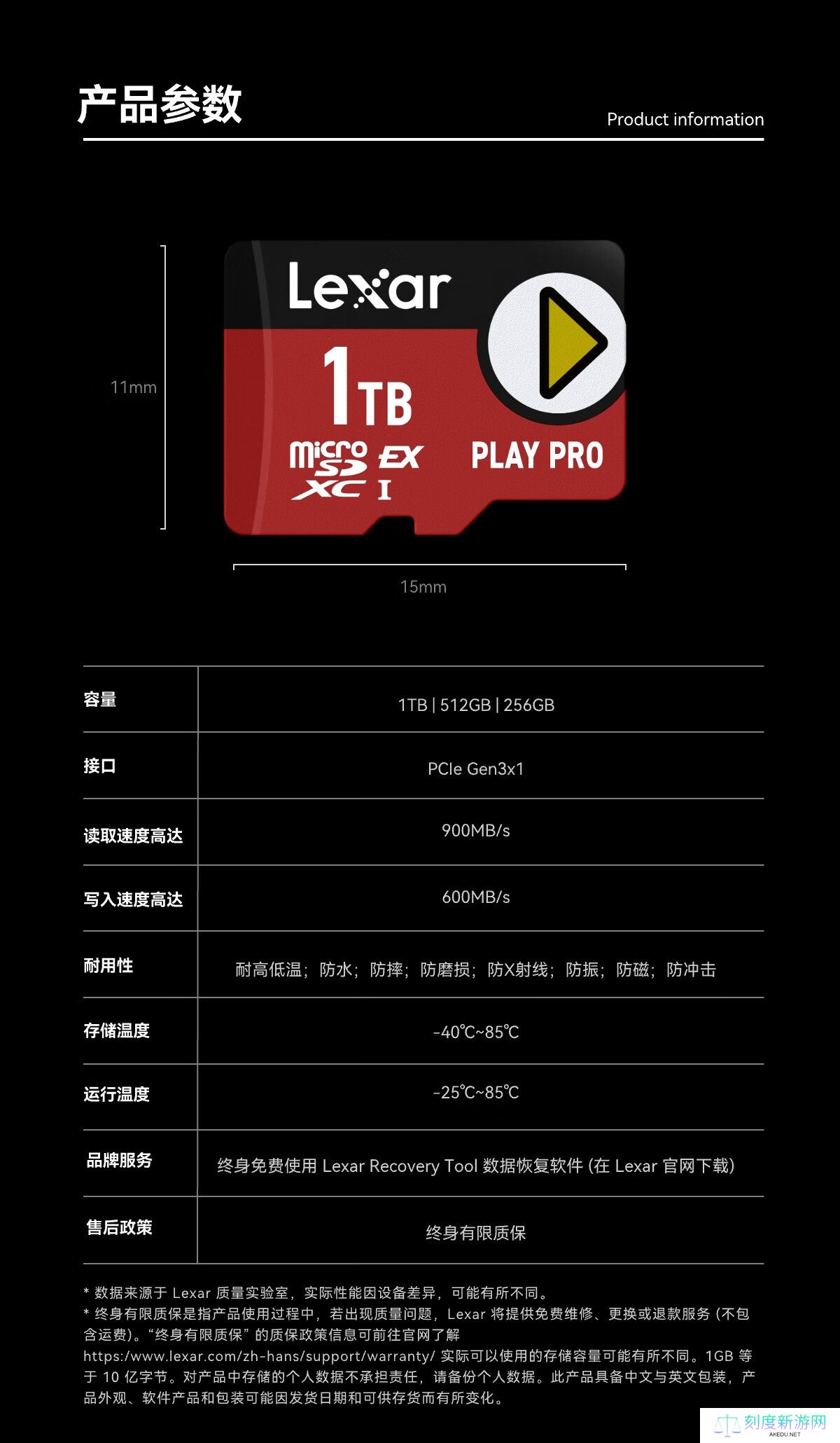 雷克沙 PLAY PRO microSDXC Express 采用基于 PCIe 3.0×1 接口和 NVMe 1.3 标准的新SD 7.1存储卡规范,顺序读取速率高达 900MB/s,顺序写入速率高达 600MB/s,并向下 UHS-I 速率兼容 UHS-I、UHS-II 主机设备。