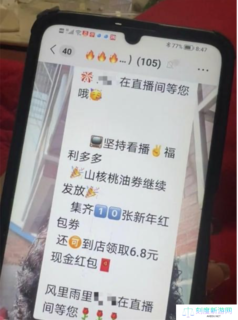 刘鹏出示的群聊截图显示,这个名为“富民路店长服务(2 群)”的群有 105 名成员,群聊十分活跃。管理员不时发布“坚持看播,福利多多”“山核桃油券继续发放”“还可到店领取 6.8 元现金红包”等信息。开播前,管理员会发红包,标注开播时间。相应“兑换券”通常在直播开始、中间、结尾 3 个时段发放,要领到券得全看完。