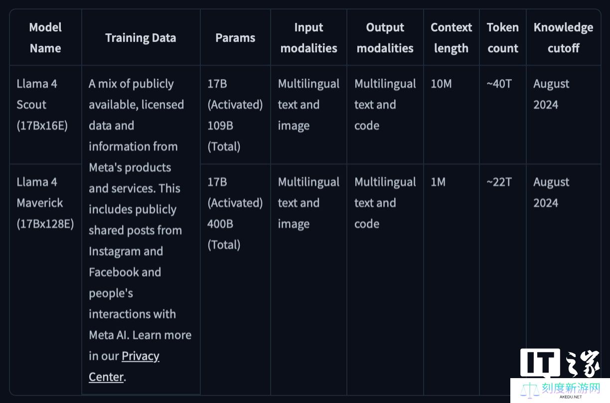 本站 4 月 6 日消息,Meta现已发布旗下最新Llama 4 系列AI 模型,包含 Llama 4 Scout、Llama 4 Maverick 和Llama 4 Behemoth,Meta 透露相应模型都经过了“大量未标注的文本、图像和视频数据”的训练,以使它们具备“广泛的视觉理解能力”。