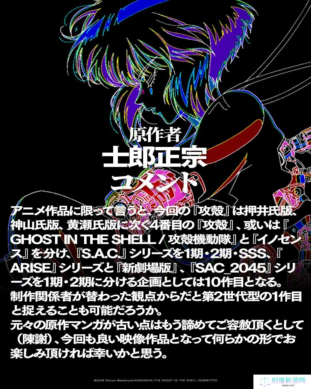 士郎正宗附言:“仅就动画作品而言,本次的《攻壳》可视为继押井守版、神山健治版、黄濑和哉版之后的第四种《攻壳》诠释,若分别计算,则本作可算作系列第十部动画企划,从制作团队更迭的角度来看,或许也可将其视为第二代团队的首部作品,原作漫画年代久远之处还望海涵,惟愿本次影像作品能呈现优质内容,以某种形式为观众带来愉悦体验。”