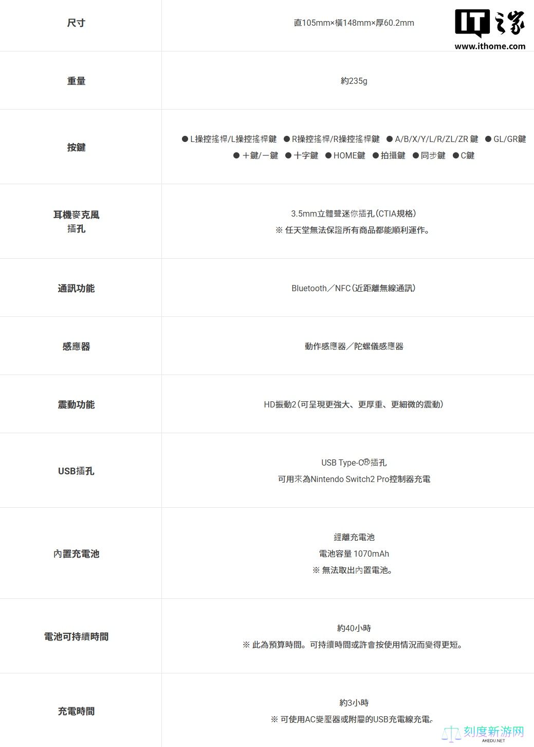 任天堂 Switch 2 全新 Pro 手柄完整规格公布:续航仍为约 40 小时,充电时间缩短 3 小时