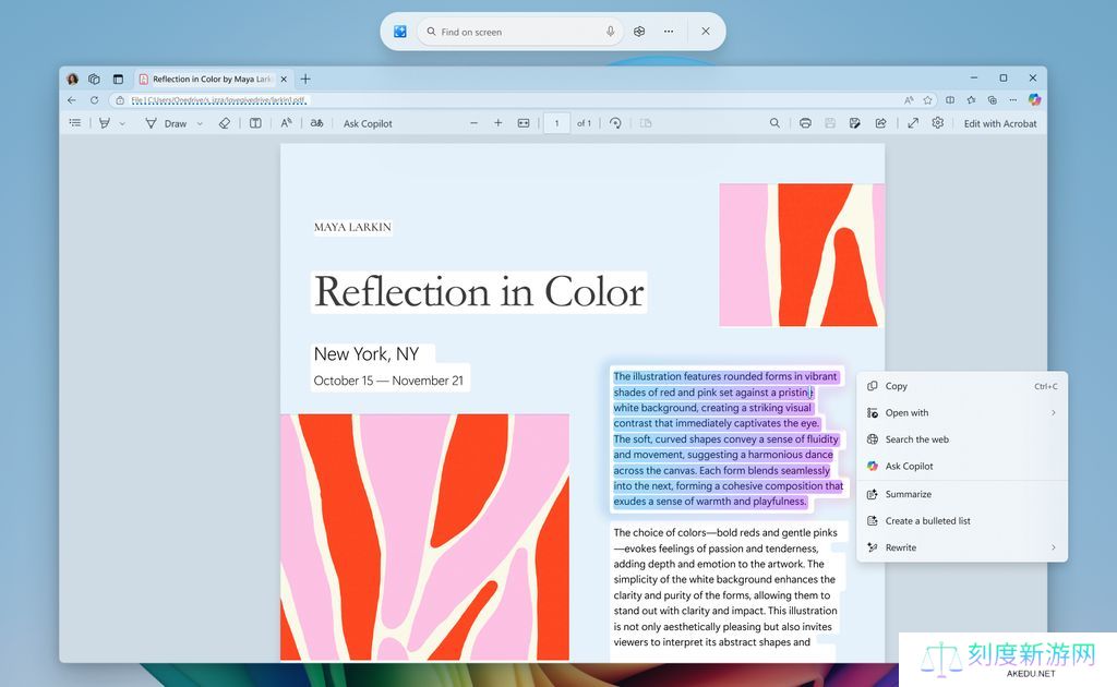 微软邀请 Dev 和 Beta 频道的 Windows 11 AI+ PC 设备用户,测试 Click to Do 功能。用户使用该功能高亮文本或者选择图片后,新增询问 Copilot 功能。用户可以在单击中将选定的文本或图像发送到 Copilot 应用程序。选定的文本或图像被交出 Copilot 程序中,用户可以在其中输入相关提示词。