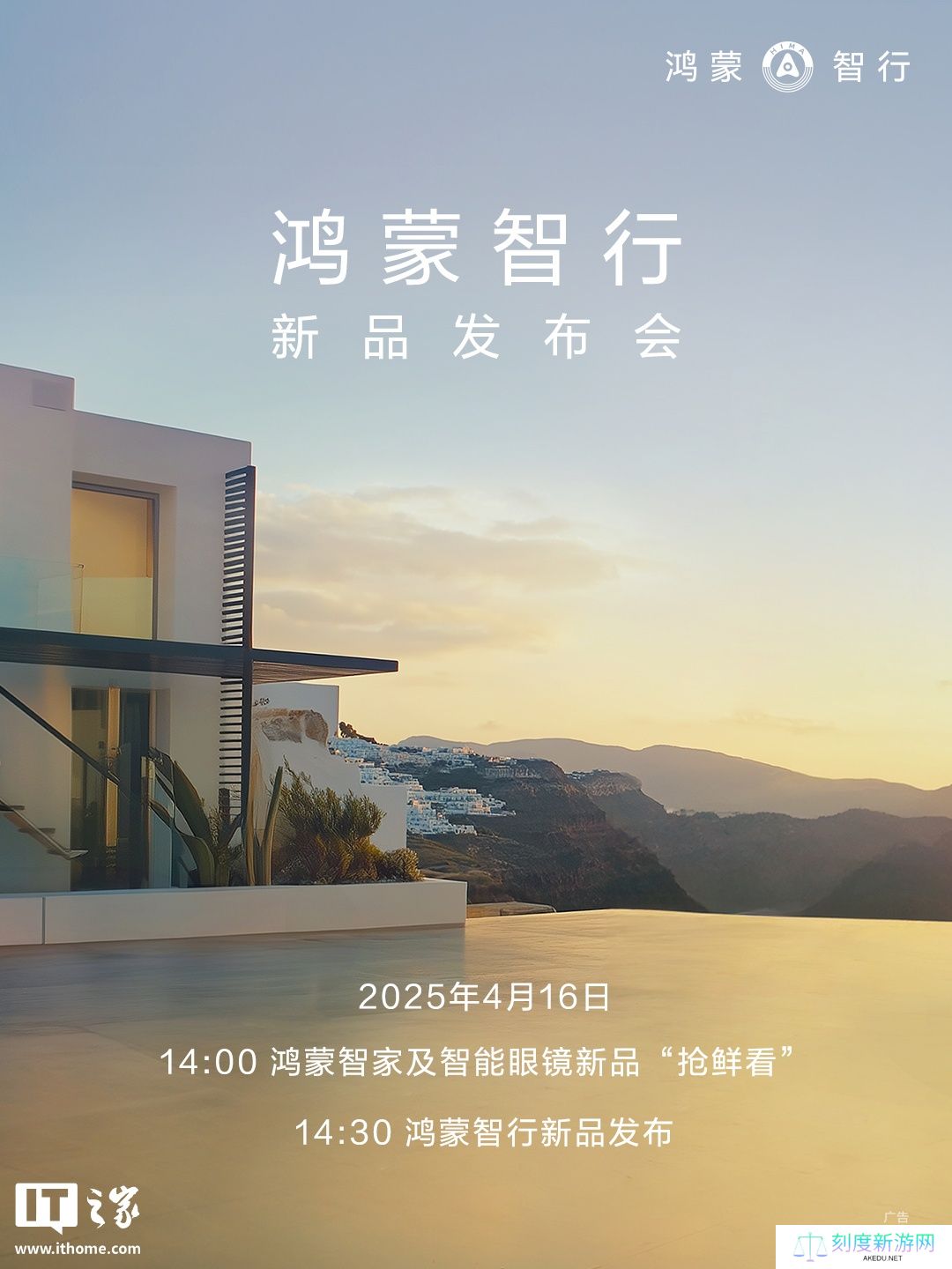 据此前报道,华为终端本月宣布鸿蒙智行新品发布会将于 4 月 16 日举行,届时将会有“王牌新品”接踵而至。预热海报显示,当日 14:00 将“抢鲜看”鸿蒙智家及智能眼镜新品、14:30 发布鸿蒙智行新品。