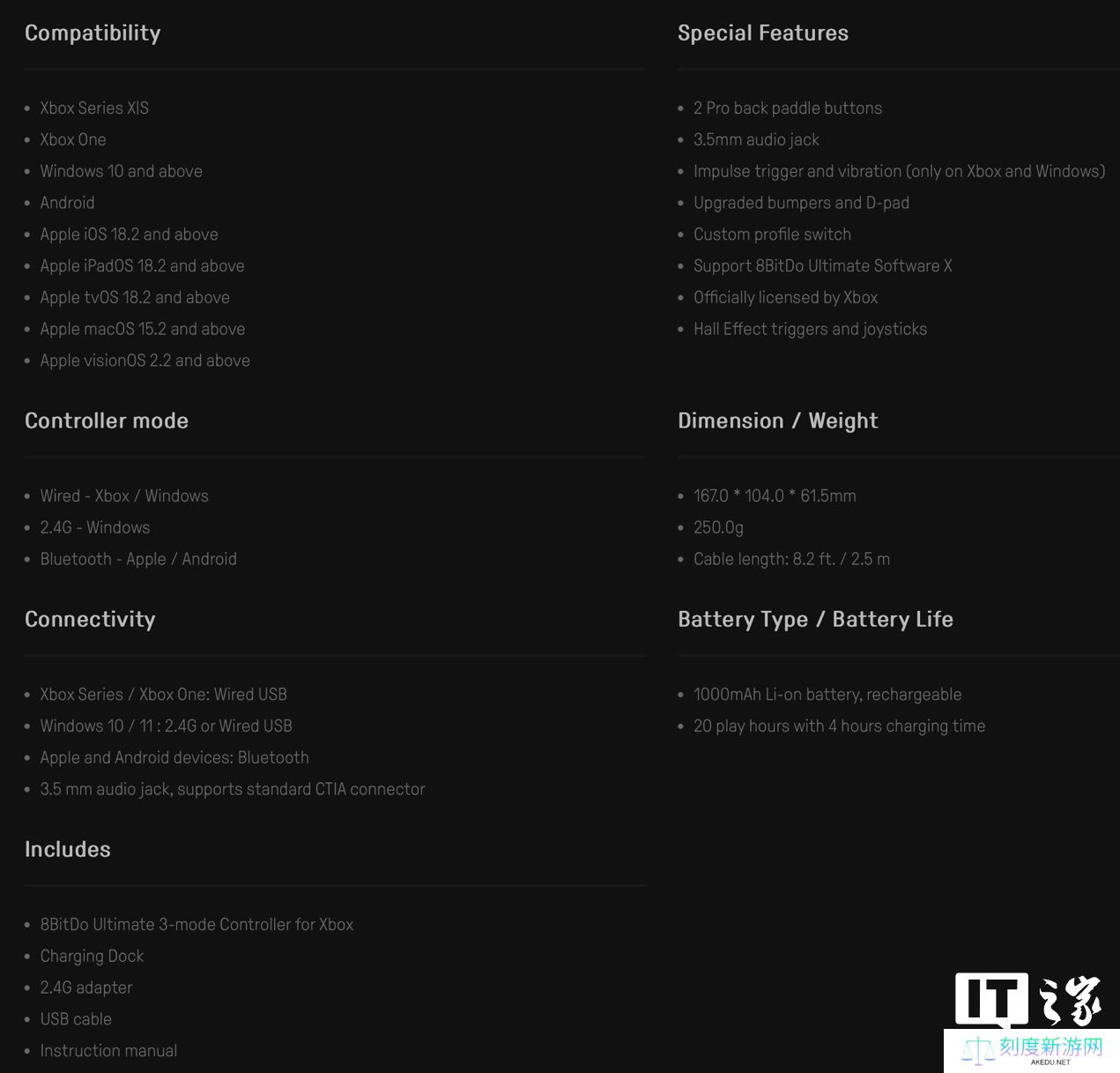 同时,该手柄由于有 Xbox 官方授权,所以具有 Xbox“西瓜”键、截图键和菜单键等 Xbox 手柄标志性按键;该手柄具有 PC、Xbox 和手机三种模式,同时支持蓝牙、USB 和 2.4G 三种连接方式,在连接 Xbox 时还可以使用位于手柄底部的 3.5mm 耳机孔。